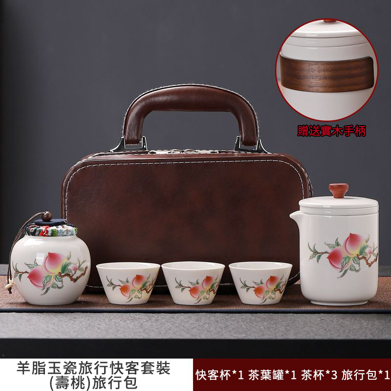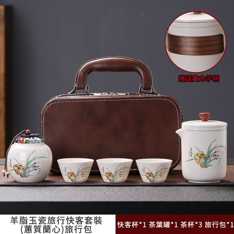 這套質樸淡雅的茶具套裝採用皮包式旅行包進行收納,整體小巧精緻,手提方便。