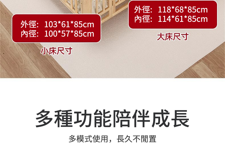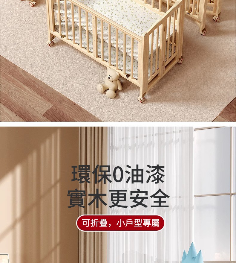 2分鐘前陪伴寶寶成長,永不閒置【嬰兒床-->遊戲床-->書桌】日本超火の可折疊嬰兒床,實木無漆更安心,可拼接大床+滑輪移動,多功能設計陪寶寶成長! - 【118*68*85cm】折疊大床+五件套+棕墊+蚊帳