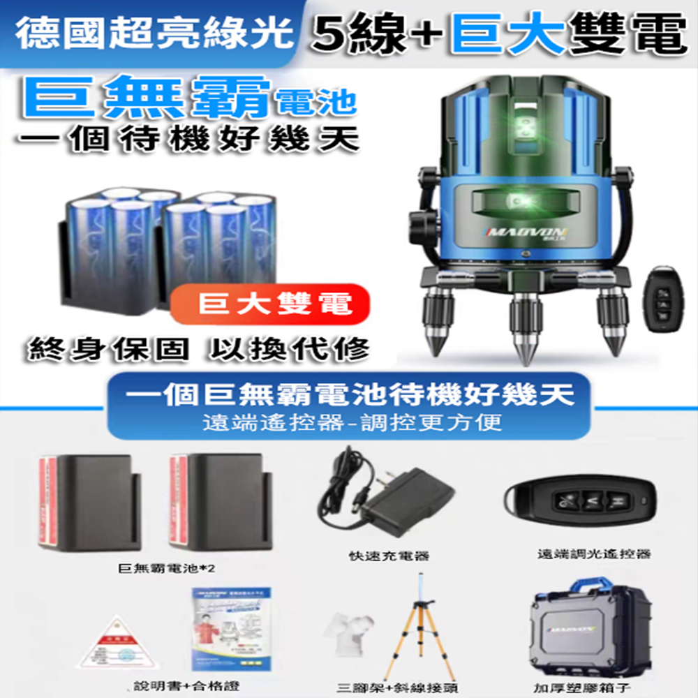 20分鐘前熱銷破萬件!戶外清晰可見【德國MAOVON】歐司朗綠光2/3/5線鐳射儀 - 【5線】巨大雙電+三腳架 +遙控 NT$3550
